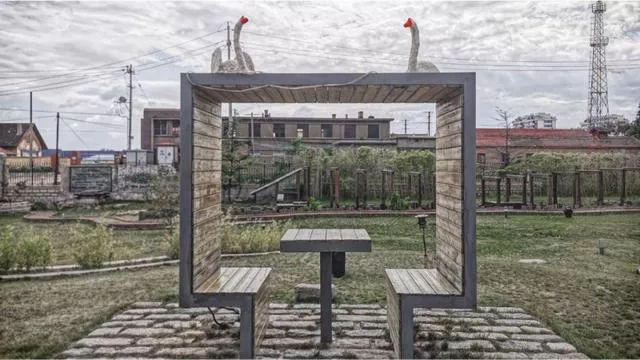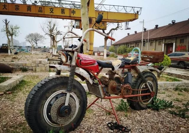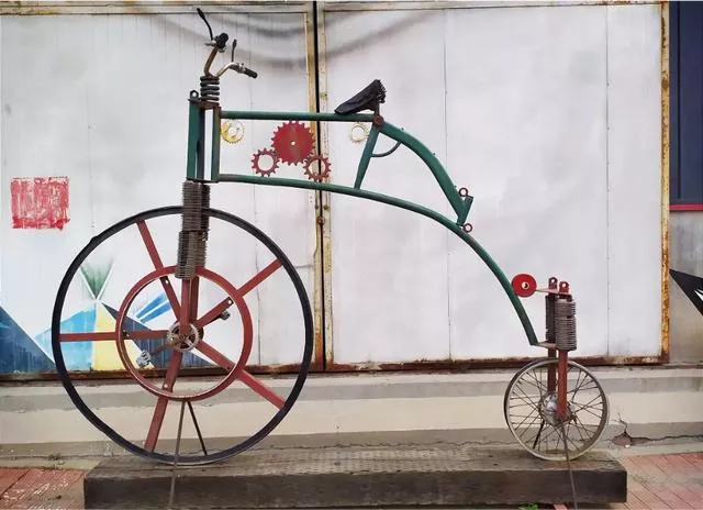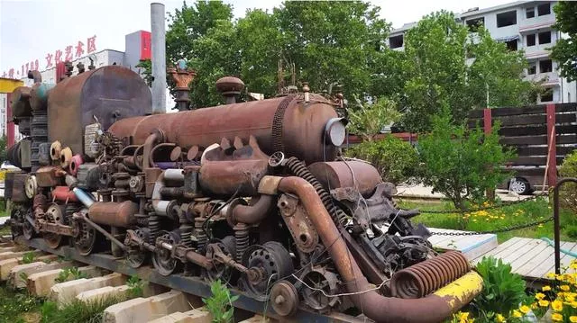 在園區(qū)入口處,一個(gè)大型的火車頭雕塑十分醒目。該雕塑是由液化氣罐、車輪等廢棄物拼裝而成。
