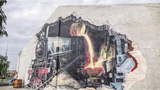 走在這些破舊的廠房中間,斑駁古舊的磚墻,老木質(zhì)的房頂,廢棄的鐵軌,綠皮的火車廂,無不透出沉重的滄桑感。