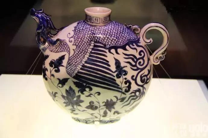 第三件為元代青花鳳首扁壺。該壺共兩尊,鸞鳳(雌雄)各一尊。一為鳳,現(xiàn)存新疆伊犁哈薩克自治州博物館;一為鸞,就藏于首都博物館。鳳首扁壺采用多種制作工藝,壺流采用模制成型,壺柄以手捏塑成型,壺體為雕鑲成型法,最后琢成整體。是一件具有很高歷史、藝術(shù)價(jià)值的珍品。