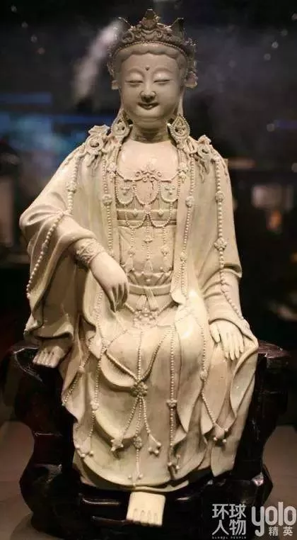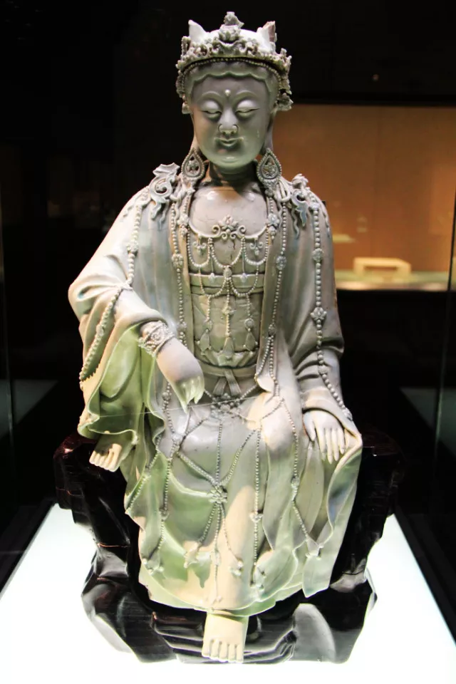 第二件能稱鎮(zhèn)館之寶的是元代景德鎮(zhèn)窯青白釉水月觀音菩薩像。此尊觀音菩薩像姿勢(shì)自然優(yōu)美,呈觀水中月姿勢(shì),故稱水月觀音。水月觀音的形象是最早唐代畫家周昉根據(jù)玄奘大唐西域記中的觀自在菩薩創(chuàng)造的造型,體現(xiàn)了元代景德鎮(zhèn)高超的瓷塑水平。