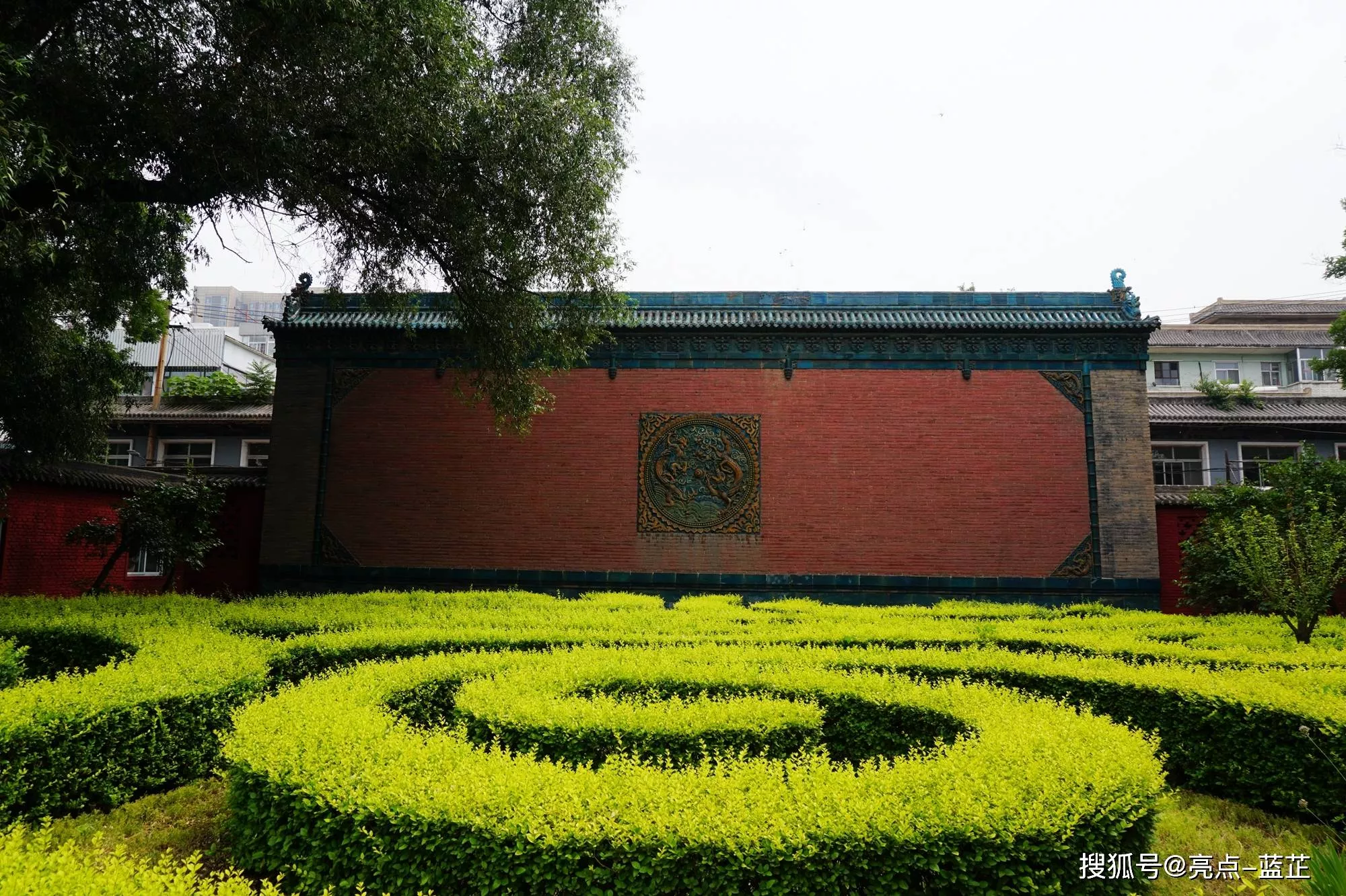 朝向欞星門一側(cè)正中間由25塊藍(lán)黃綠三色琉璃磚拼成長(zhǎng)3米、寬3米的正方形圖案,繪流云海水、雙龍戲珠,藍(lán)色天空映襯下的兩條云龍翻騰于碧綠海水之上,以蓮花紋勾勒出圓形主圖案,四角鑲嵌花卉紋飾,形成外方內(nèi)圓的布局,和中國(guó)古代士大夫所推崇的“天圓地方”傳統(tǒng)哲學(xué)思想相吻合,這樣的設(shè)計(jì)蘊(yùn)含了其紋飾造型以外深刻的文化內(nèi)涵。