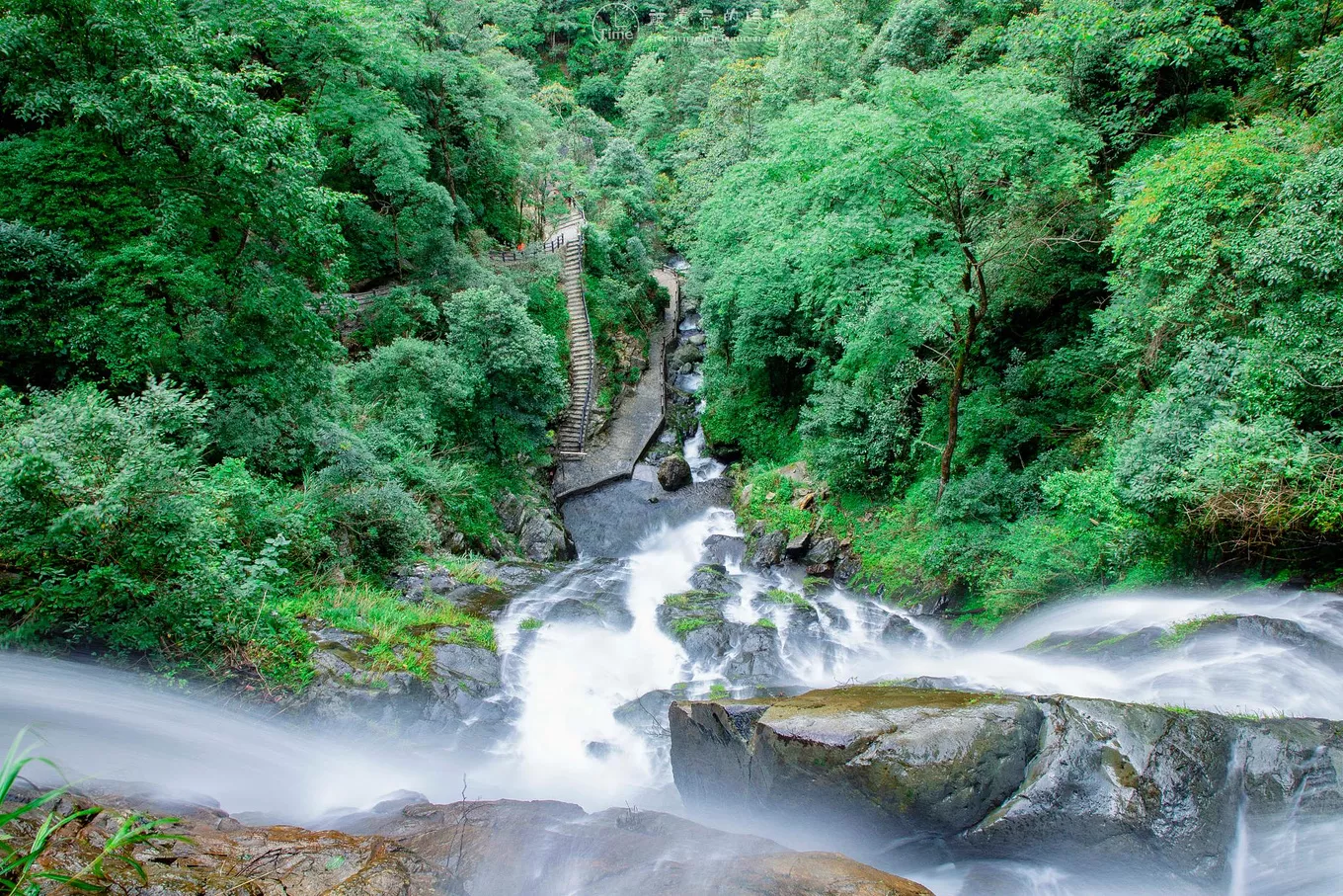 這里最徒步愛好者的圣地,林中小道兩側(cè)是茂密的樹木,密密的、雜亂的,各種樹木盤根錯節(jié),插入深深淺淺的裂隙孔竅。沿林間小徑拾級而上,一路上都是各種豐富的珍稀物種,還能在影影綽綽之間不時瞥見遠處險峻無邊的瀑布群。峭壁千仞,錐鋒聳立,谷底響水奔流、亂石穿空,置身其間,感慨大自然的變幻莫測,頓時讓人肅然起敬。
