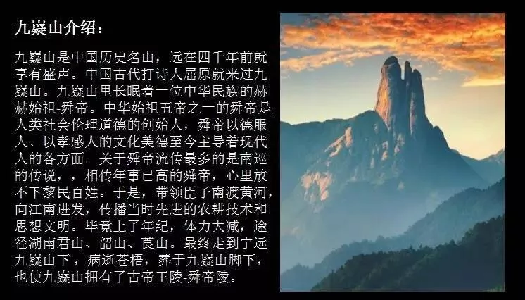 九嶷山是中國歷史名山,遠(yuǎn)在四千年前就享有盛聲。中國古代打詩人屈原就來過九嶷山。九嶷山里長眠著一位中華民族的赫赫始祖-舜帝。中華始祖五帝之一的舜帝是人類社會倫理道德的創(chuàng)始人,舜帝以德服人、以孝感人的文化美德至今主導(dǎo)著現(xiàn)代人的各方面。