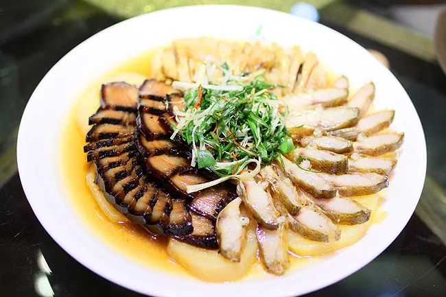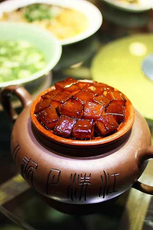 茭白干壇子肉。壇子口均勻地碼著一層濃油赤醬、色澤紅亮的五花肉,壇子移動(dòng),五花肉抖動(dòng),超級(jí)誘人??纯床嗣?,才知道內(nèi)有乾坤,除了讓人垂涎欲滴的五花肉,壇子里是淀山湖三白之一——茭白干。茭白干吸足了五花肉的油汁,味道極好。