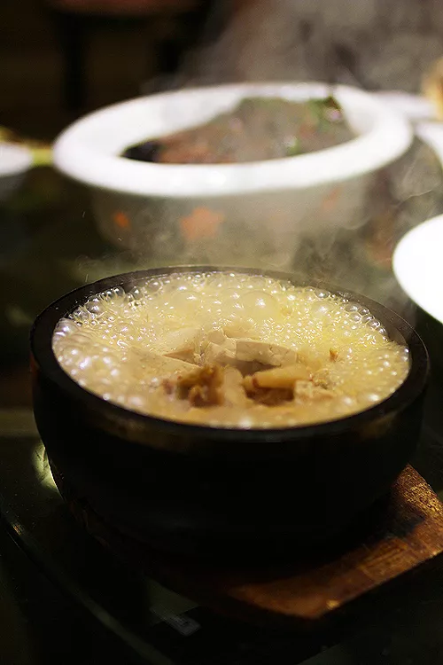 待湯汁落幕,才能看到石鍋里的真面目,老豆腐、河蚌肉、薄五花。。內(nèi)容豐富。