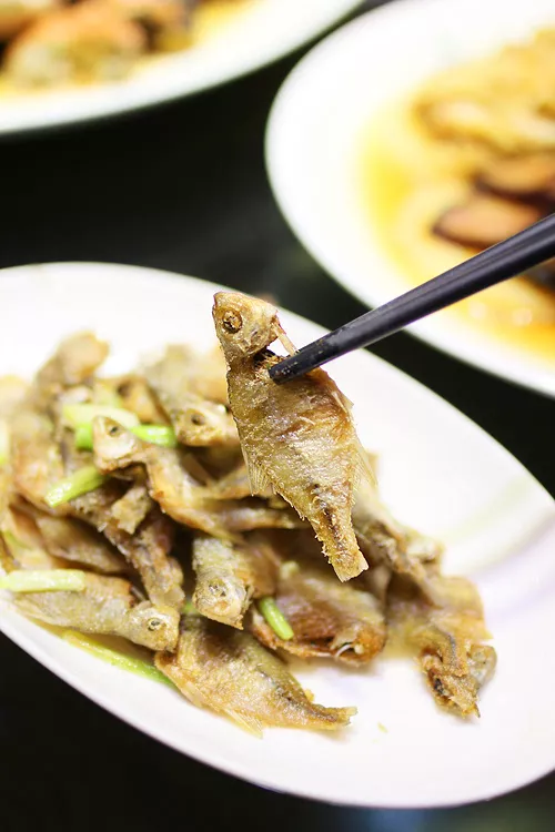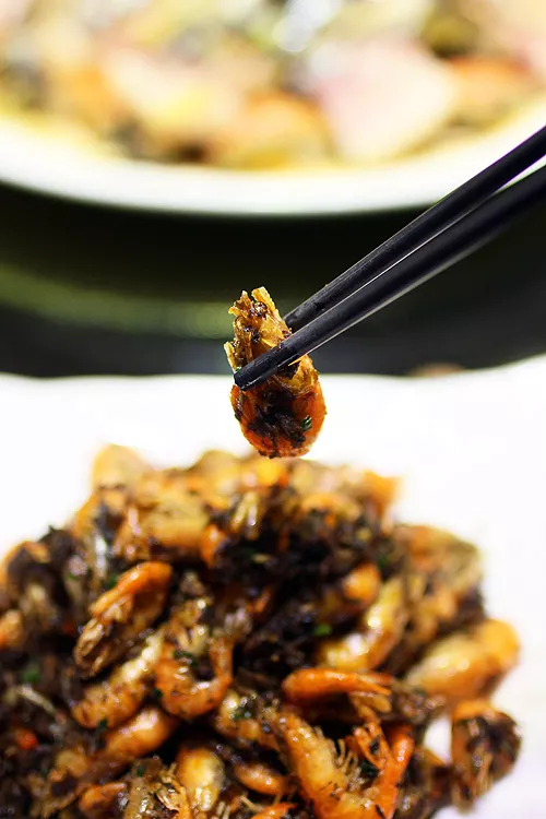 梅菜河蝦。這道菜用到的就是白米蝦,經(jīng)過(guò)高溫炸制,蝦殼酥脆蝦肉鮮嫩,再混合梅干菜同炒,滋味鮮美。
