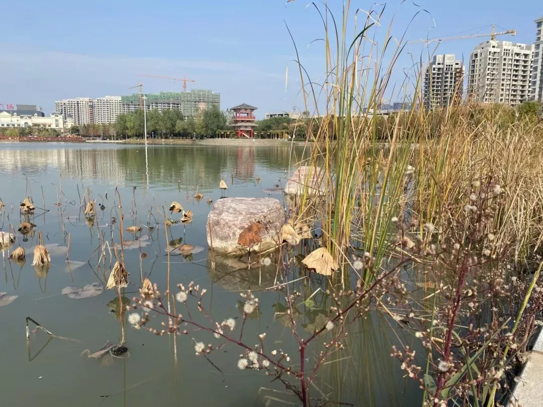踏著青石臺階或沿著盤山坡道來到山頂,以及登臨十多米高的觀水亭,可以俯瞰整個(gè)湖區(qū),繞湖車道、步行園道和布石小徑、健康游道如三條紅飄帶圍繞湖區(qū),東北角的正清林里修竹清風(fēng),魅影婆娑,加之林立高樓倒映水中,真是湖光山色美不勝收。