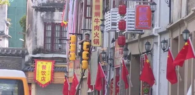 在美食街上,建筑外立面修舊如舊,粉刷上了黃色墻漆,門窗也換上新裝,顯得古色古香?,F(xiàn)場,工人們正在將寫著“美食街”字樣的黃色燈籠懸掛在道路兩邊,街上鮮艷的國旗迎風(fēng)飄揚(yáng),節(jié)日氣氛濃烈。