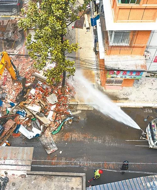 灑水車實時對拆除點位進行降塵。圖片來源:武漢晚報