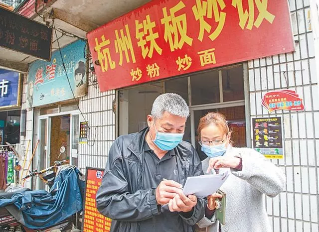 社區(qū)工作人員逐戶上門與經(jīng)營者溝通。圖片來源:武漢晚報
