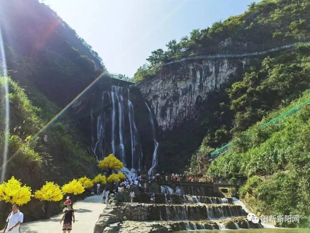 乘坐景區(qū)公共交通抵達(dá)目的地,走過一條充滿藝術(shù)氣息的“花路”,就看到了秀麗的瀑布群?!敖窆砰L如白練飛,一條界破青山色”,陽光照耀下,瀑布仿佛一條銀龍從山頂俯瞰,細(xì)長的身影在晴日下,粼粼爍爍,晶晶亮亮。