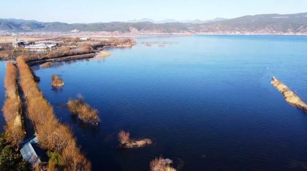 ↑2月6日拍攝的拉市海自然保護(hù)區(qū)(無(wú)人機(jī)照片)。