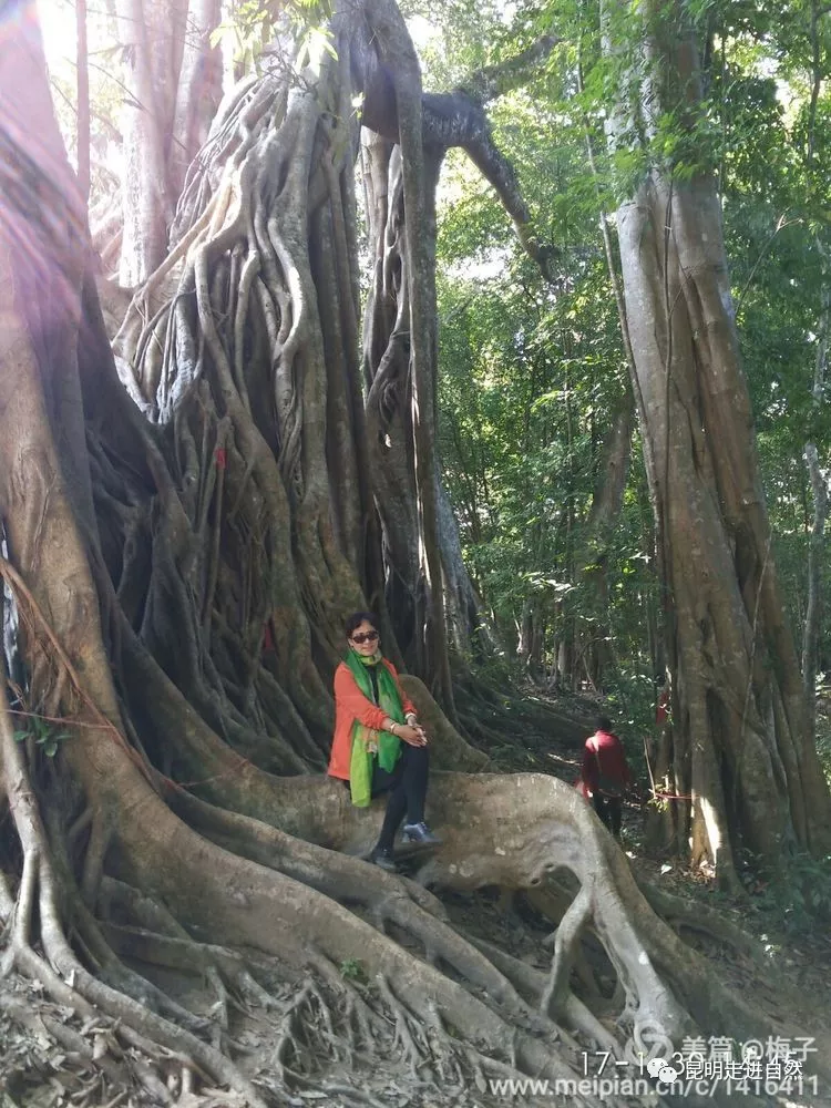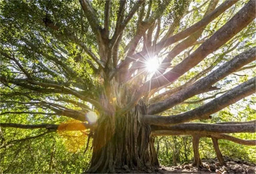 還有那十余米長,一米多粗的貼地橫出的樹干,如巨人伸出一只力舉萬鈞的手臂,又似一條蓄勢待發(fā),急欲騰飛的巨龍。那藤蔓交錯的虬枝,那在微風(fēng)中如珠簾般飄拂的須根,無不使您心旌神搖,產(chǎn)生無窮遐想。