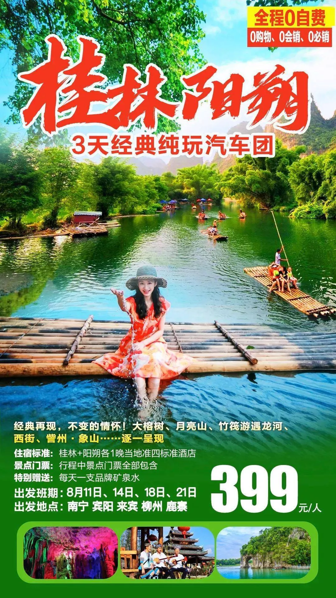 有錢有時間一起游桂林:純玩不進(jìn)店!僅售399元陽朔金水巖,山里古寨,大榕樹,竹筏遇龍河,王城東西巷,訾洲公園純玩三日游