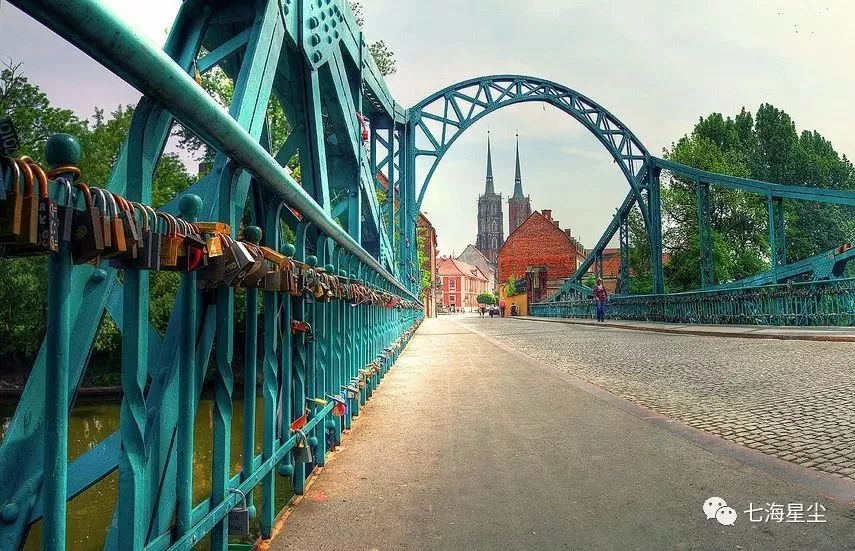 奧得河流經(jīng)市區(qū),將城市分為12座小島,島與島之間由100多座橋梁相連,不由讓人想起水城威尼斯。在所有島嶼中最有名的當(dāng)數(shù)座堂島Ostrów Tumski,座堂島是該市最早形成的街區(qū),后來城市以此為核心發(fā)展到奧得河兩岸。通往座堂島上的必經(jīng)之路上,橫跨著被稱為情人橋的Tumski橋,冰激凌藍(lán)色的大橋欄桿上掛滿了大大小小的同心鎖,承載著愛人們不愿離別的愛情愿望。在座堂島上坐落著弗羅茨瓦夫的主教教堂——施洗圣約翰大教堂,座堂島也因此被稱為“大教堂島”。