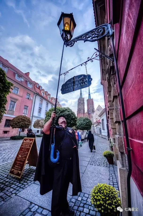 除了小矮人之外,點(diǎn)燈人也是弗拉茨瓦夫的標(biāo)志。每當(dāng)夜幕降臨,他們會穿戴好自己獨(dú)特的斗篷和禮帽,從連接沙島和老城的Tumski橋開始,依次點(diǎn)亮座堂島區(qū)域的103盞燃?xì)鉄?,每日清晨再將他們熄滅,一?65天,風(fēng)雨無阻。目前全歐洲僅剩佛羅茨瓦夫和白俄羅斯的布雷斯特仍然保留了這項(xiàng)傳統(tǒng)職業(yè),也給這座城籠罩上一層浪漫古老的色彩。