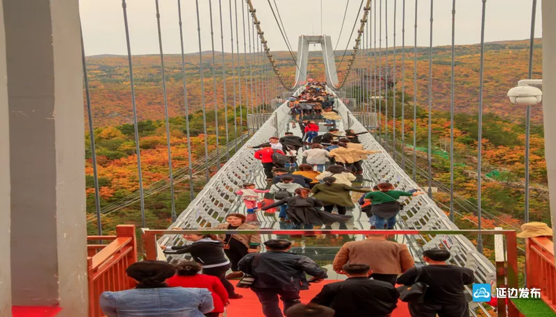 到達(dá)電視轉(zhuǎn)播臺后,再沿木棧道向前行走5分鐘后,就抵達(dá)了東三省最長的5D玻璃吊橋了。在吊橋上,向東可看到龍井全貌,向西可看到習(xí)主席視察過的光東村,金黃色的麥浪,一望無垠。行走在吊橋上,仿佛行走在云端,吹著暖洋洋的秋風(fēng),低頭看,腳下是聞名遐邇的海蘭江,緩緩流淌,遠(yuǎn)望一山挨著一山,黃綠相間,真正的五花山。吊橋下面有一只仿真小猴子,會動會啼叫,帶來不少野趣。