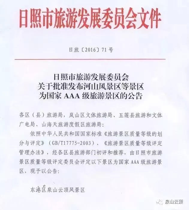 2016年底,經(jīng)日照旅游景區(qū)質(zhì)量等級評定委會評定,泉山云頂風(fēng)景區(qū)符合國家級《旅游景區(qū)質(zhì)量等級的劃分與評定》和《旅游景區(qū)質(zhì)量等級評定管理辦法》,正式批準(zhǔn)為國家AAA級旅游景區(qū)。