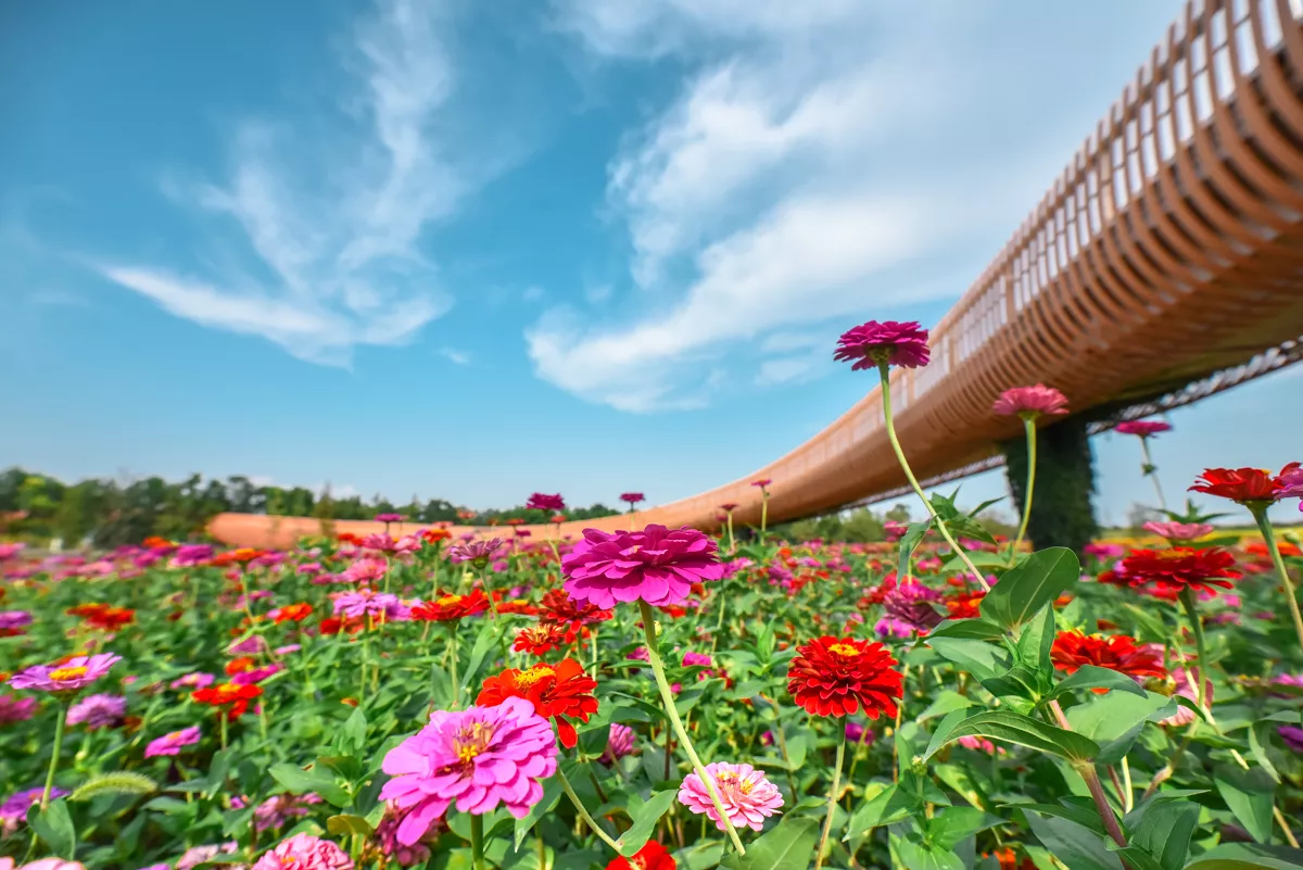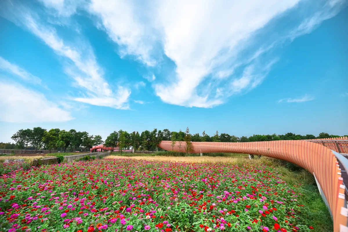 總面積2220畝,由612塊花田 “縫補(bǔ)”拼接而成,融合了北方旱梯田的雄渾和南方水梯田的俊秀,樸質(zhì)卻熠熠生輝。這里栽植著50多種花卉,自南向北形成黃、紅、紫三大色區(qū),游人視角,高低錯(cuò)落的花田與蜿蜒起伏的棧橋,融為一幅立體畫卷。站在全長2.3公里的彩虹橋俯瞰花海,聽花開花落,嗅濃郁芬芳,感受濃濃的原鄉(xiāng)情懷。向日葵、粉黛亂子草、醉蝶花、硫華菊等五顏六色鮮花,令人眼花繚亂,賞心悅目。