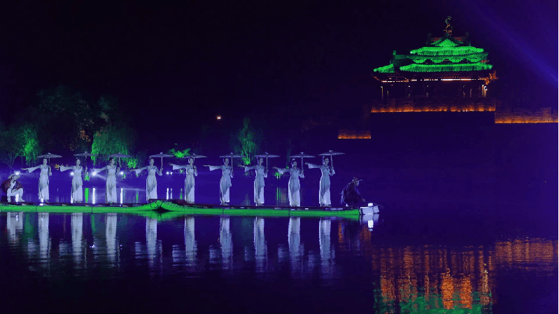 耳畔突然響起陣陣鼓聲,人群不約而同地涌向太極廣場。實景光影秀《逍遙游》即將在晚上八點上演。平靜的水面倒映著湖畔的燈光,恍若從古時穿越而來的舞者隨音起舞,素衣、紅傘、綠竹、粉花……融合在聲、光、影之中。最終,水幕投影與水中舞臺融為一體,為觀眾們再現(xiàn)了一場江湖穿越千年的仙俠情緣。