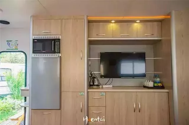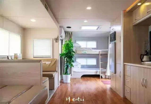 另外 房車里的硬件設施絕對過關,有廁所、洗浴間以及烤箱、冰箱、兩臺空調和四人座椅等。 值得一提的是,廁所和洗浴間是多擴展出去的部分,也讓車廂里的客廳空間絲毫 沒有受到影響。