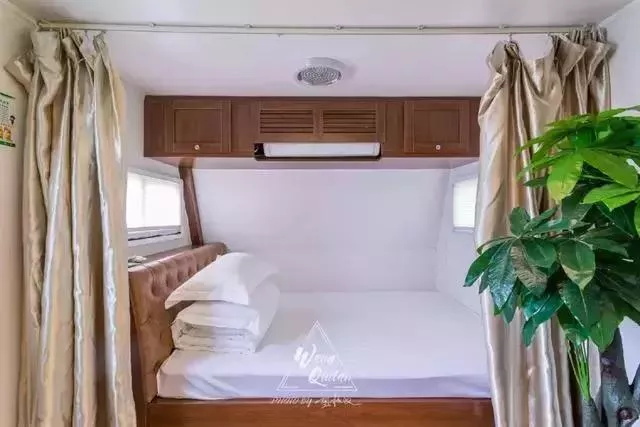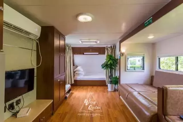 打開門走進房車,蘇小游沒想到房車內部空間非常大。麻雀雖小,五臟俱全。車頭車尾分別有一張大床和上下鋪的單人床,完全滿足一家三口甚至一家四口居住。并且車頭車尾都有布簾,能夠較好的保持私密性。
