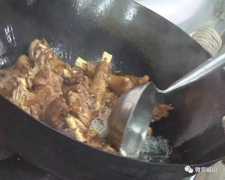 特色菜黃金河炒雞,因為用的是景區(qū)自養(yǎng)的跑山雞,肉質(zhì)相比市場上的肉雞更加緊實。而且每一份炒雞都是用一整只雞來制作,份量絕對實惠,這也正好應(yīng)對游客玩累了想大吃一頓的心情。制作流程是先把雞肉切塊涼水下鍋,經(jīng)過逐漸升溫,肉里的血污都被排出,這時候就可以開始入味制作了,王師傅在雞肉里加入了老湯來燉。這老湯用的是黃金河炒雞的秘制配方,據(jù)說是用雞肉加入調(diào)味品,足足熬制8個小時。老湯開鍋了,再用高壓鍋把雞肉燜熟,然后就進入最關(guān)鍵的一步,炒雞。