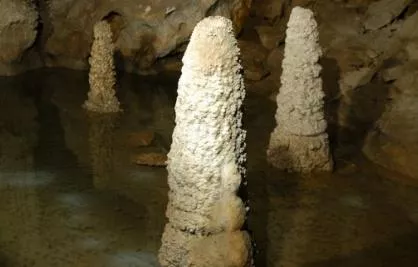 人間洞廳長70米,寬35米,高18米,主要景觀有網(wǎng)狀卷曲石、霸王鞭、擎天柱、懸空寺、金蟬戲金魚等。洞內(nèi)石筍、石塔、石鐘乳、石柱遍布,最大的石柱高8.5米,胸圍4.3米,被稱為擎天柱。由于洞頂落下的水滴多次飛濺、鈣化沉積而形成的石花比比皆是。“網(wǎng)狀卷曲石”更是崆山白云洞的一絕,在我國其他溶洞中極為罕見。