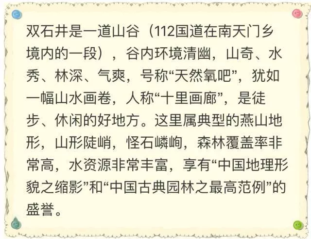 實(shí)際上雙石井是南天門滿族鄉(xiāng)的景點(diǎn)之一,擁有如此絕美的景點(diǎn),此地必然非凡!南天門滿族鄉(xiāng)位于河北興隆縣城東南部。成立于1989年1月1日,是興隆縣境內(nèi)僅有的兩個(gè)少數(shù)民族鄉(xiāng)之一,聚居著滿族、回族、蒙族、壯族、水族等。由于叫做“滿族鄉(xiāng)”,其滿族文化自然最吸引眼球。那里是一個(gè)滿族風(fēng)情山寨,很多滿族古民居都被精心還原,具備接待功能的滿族民居、仿古式滿族牌樓、滿族文化展廳等滿族文化體驗(yàn)設(shè)施應(yīng)有盡有。臨街的住戶圍墻都極具滿族特色,地方打造的滿族文化長廊更是吸引了很多游客。當(dāng)?shù)氐碾p石井酒廣受好評(píng),該酒實(shí)為德隆酒業(yè)釀制,由于釀制原料是雙石井的天然山泉和在得天獨(dú)厚的自然條件下生長的燕山五谷,故以“雙石井”的名字命名。
