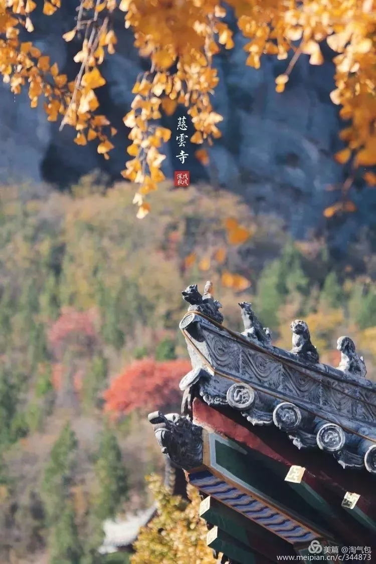 秋天是青龍山慈云寺最浪漫和激情的季節(jié),從山門沿山路而上,大自然神奇妙筆為這座山披上了五彩的花衣,展示了它的美好和絢麗。黃瓦、紅墻、火紅的紅葉、金黃的銀杏,令你心曠神怡、久久沉醉。
