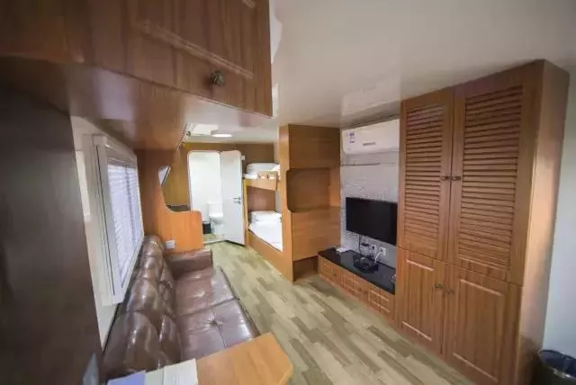 ▲房車內(nèi)部裝修精良,設(shè)有雙人大床、上下小床、網(wǎng)絡(luò)、冰箱、電視、獨立衛(wèi)生間、淋浴間等一應(yīng)俱全