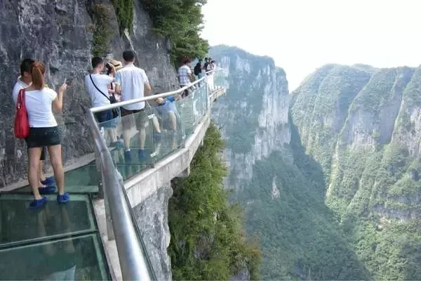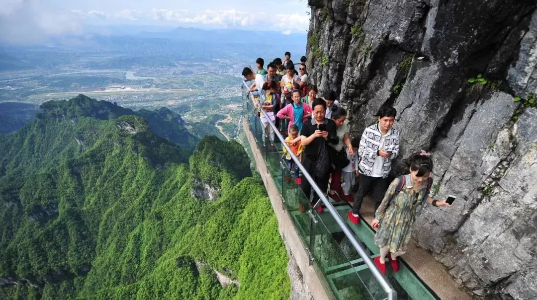 以張家界天門山玻璃棧道為例,這條看著就讓人腿軟的玻璃棧道給人帶來的刺激震撼感。