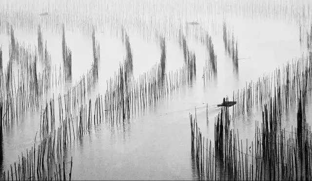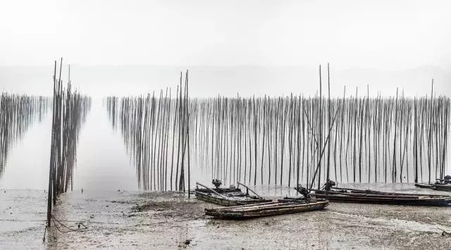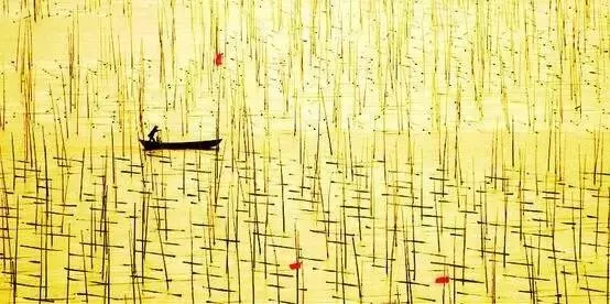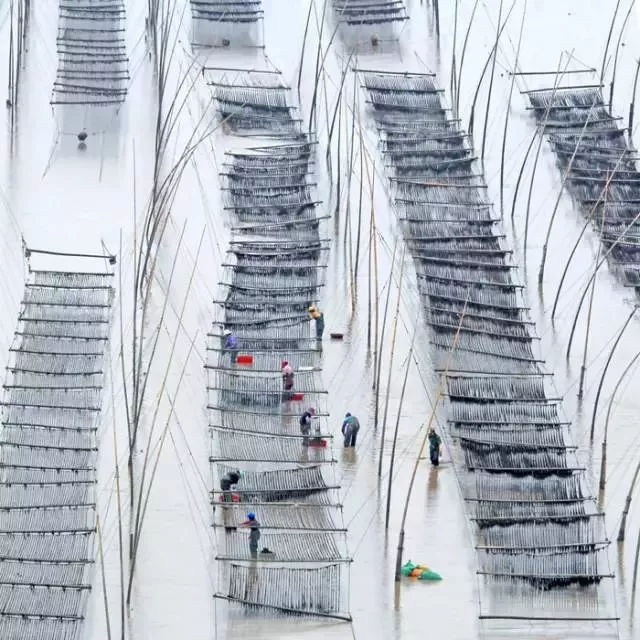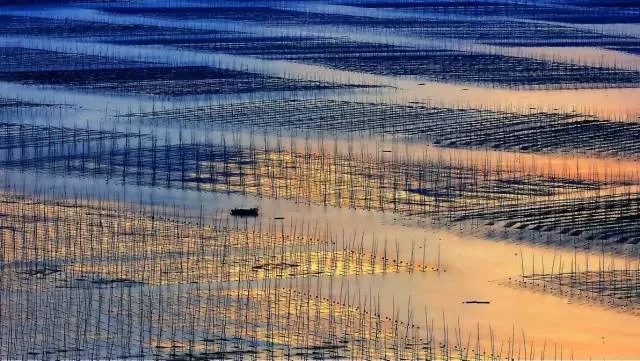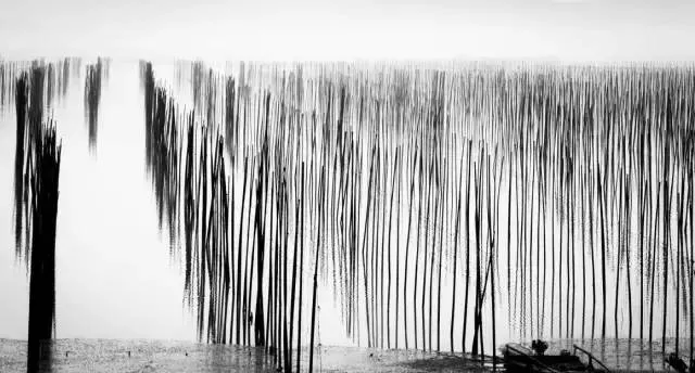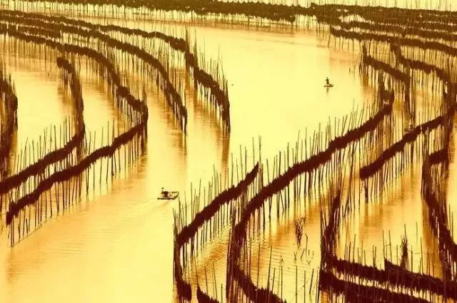 密密麻麻插滿了用來晾曬紫菜的的竹竿
