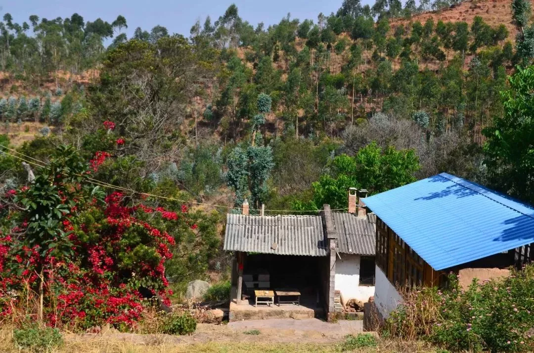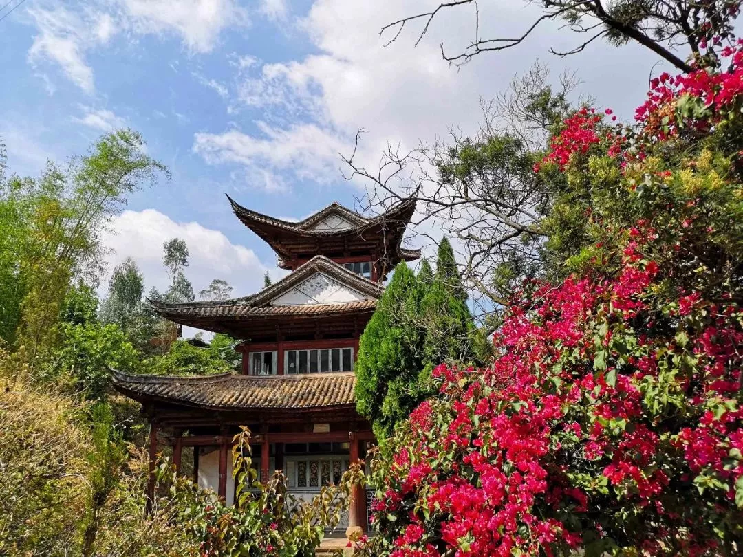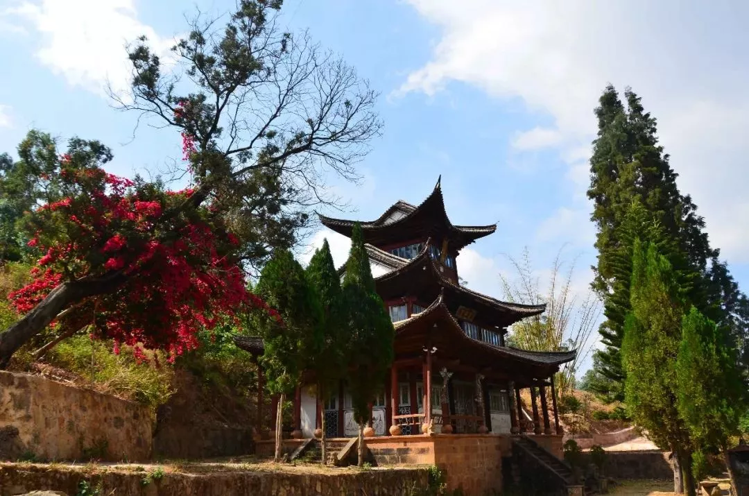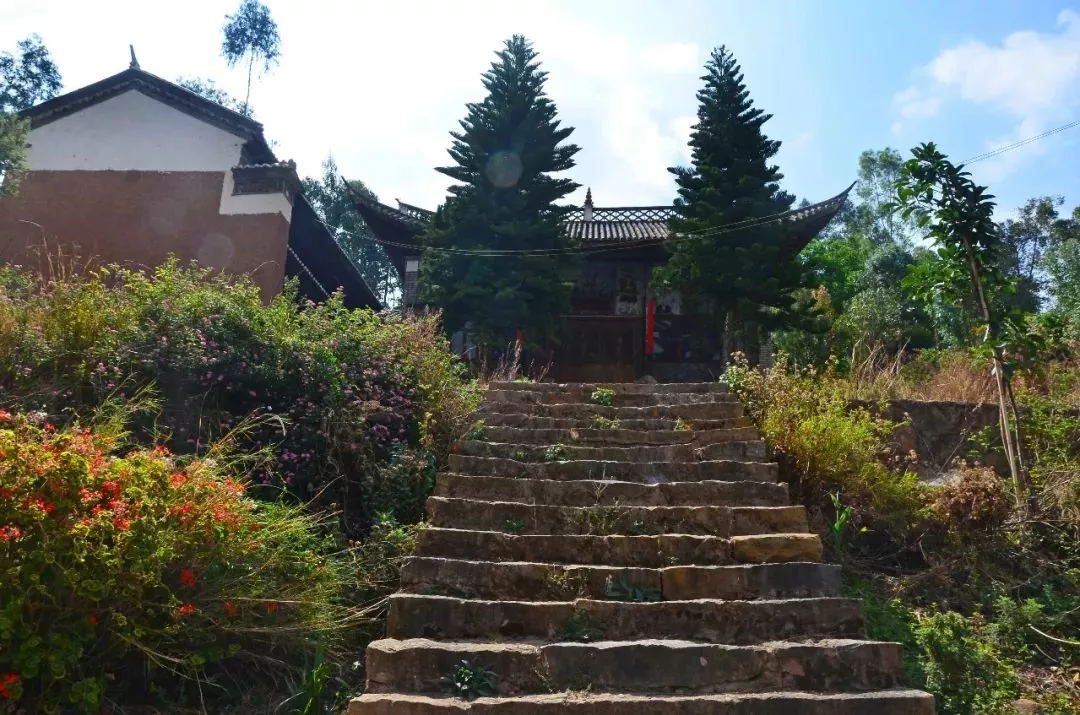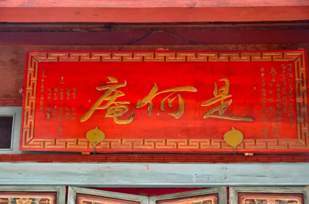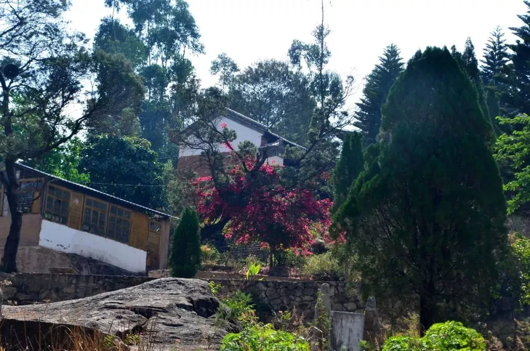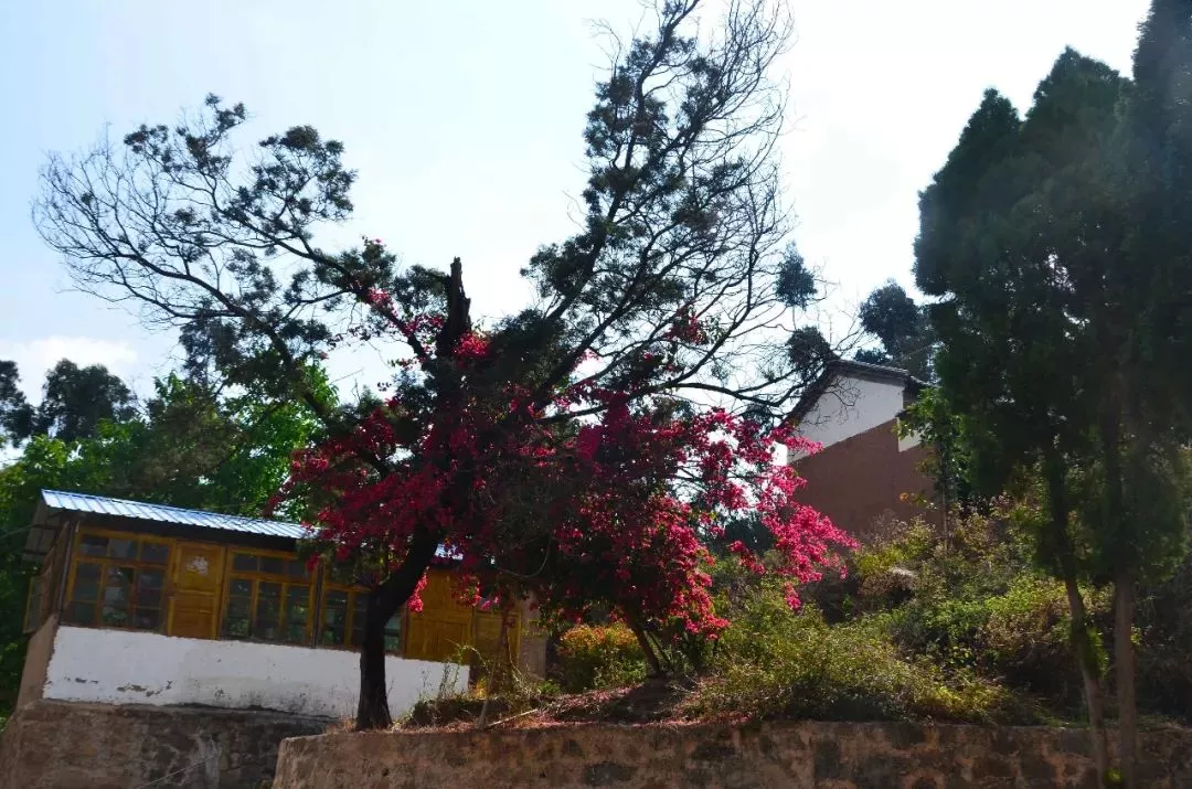 是何庵處于半山腰處,右邊可俯瞰下方鄉(xiāng)鎮(zhèn)全景,左邊有一株三角梅,開(kāi)得正燦爛,三角梅后邊是一排簡(jiǎn)易房子,從布置看應(yīng)是廚房廂房,可能是管理打掃的人居住的,不過(guò)如今卻是荒廢著。