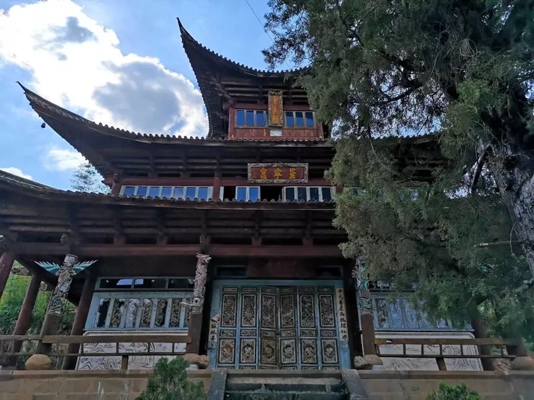 廚房前面有一條石階小路,兩旁長(zhǎng)滿花花草草,路的盡頭是一座古樸的建筑,寫(xiě)著財(cái)神殿,滿是彩繪和壁畫(huà)。房前有兩株柏樹(shù),高大粗壯,不知長(zhǎng)了多少年。