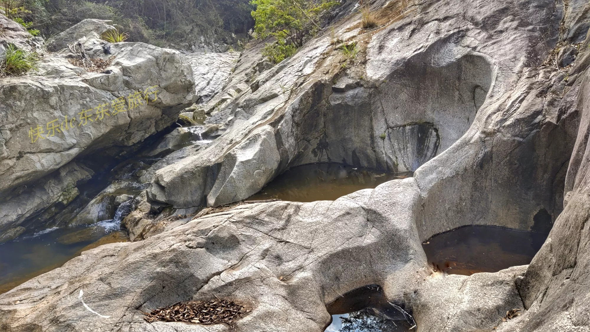 九重坑上面有一段比較平緩的河段,河底也有不少巨石。巨石長(zhǎng)期被流石和洪水沖刷,上面也有不少形態(tài)各異、深淺不同的石臼,看起來也很有趣,安全性也高得多。這里拍照很愜意。