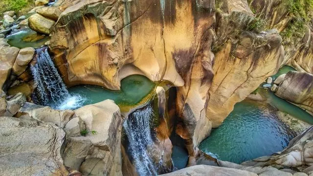 最漂亮、最壯觀、最驚險(xiǎn)的是距離村莊最近的那段,百米高的懸崖峭壁下面是深不見底的水潭,瀑布從懸崖上方奔流而下,沖刷出一個(gè)又一個(gè)漂亮的巨型石臼,看得人贊嘆不已又有點(diǎn)心驚膽戰(zhàn)。