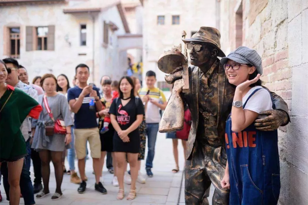 此次電影小鎮(zhèn)復(fù)開,推出了一系列升級版的演藝新作品。游客入園之初就可以看到卓別林主題的演藝秀,置身電影小鎮(zhèn),游客可以偶遇數(shù)百名“卓別林”,安檢員、驗票員、演員、商店店員……不同身份的“卓別林”環(huán)繞身旁,仿佛置身默片時代的電影場景中。