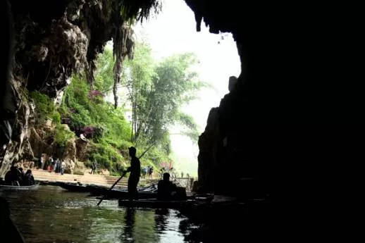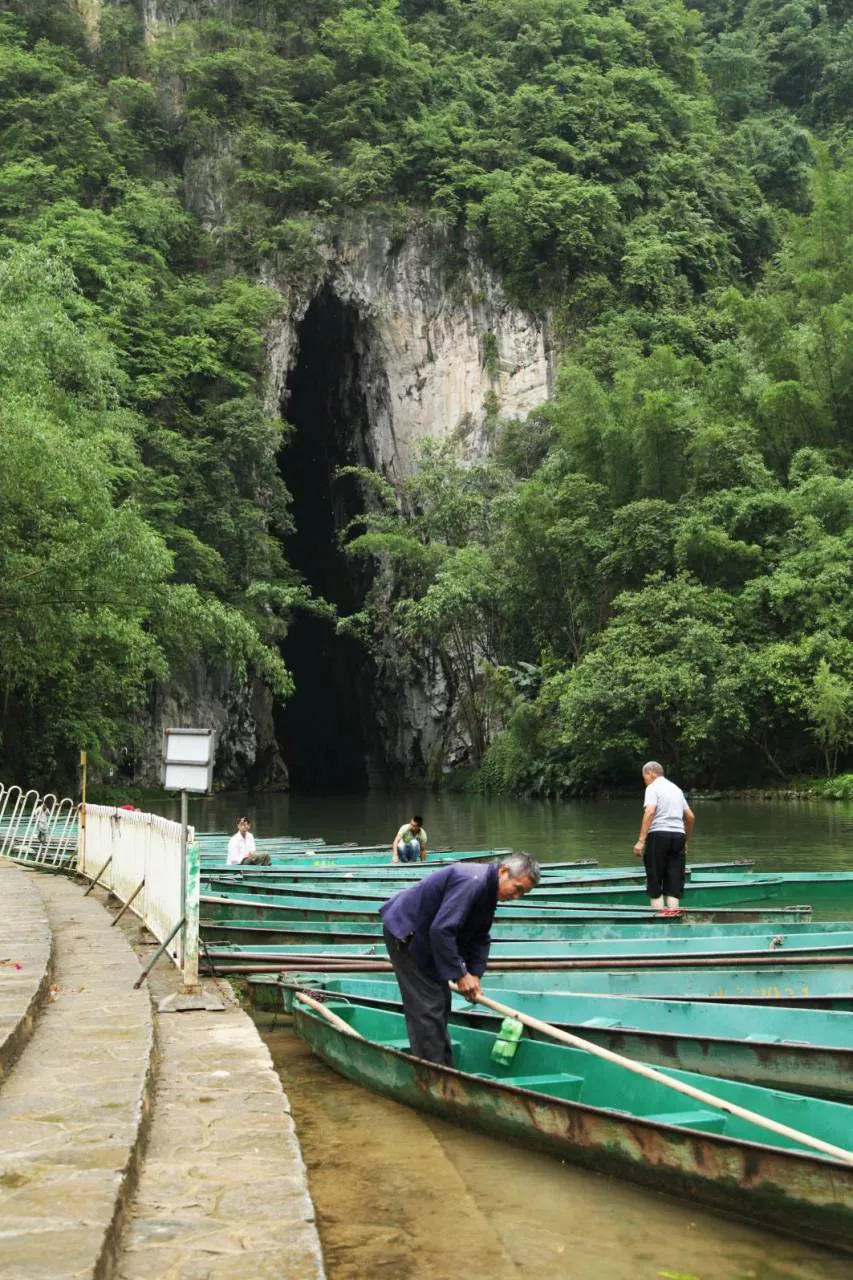 在昏暗的水洞中沐浴了二十多分鐘的涼風后,一束光出現(xiàn)了,接著便可看到洞口吱呀作響的水車、壯族少女婀娜的身姿,船到岸了。拾級而上,眼前頓時豁然開朗:淡藍色的馱娘江在不遠處向你招手,碧綠的田野間農人正辛勤地勞作,翠竹、桃林深處掩映著古樸的村舍。