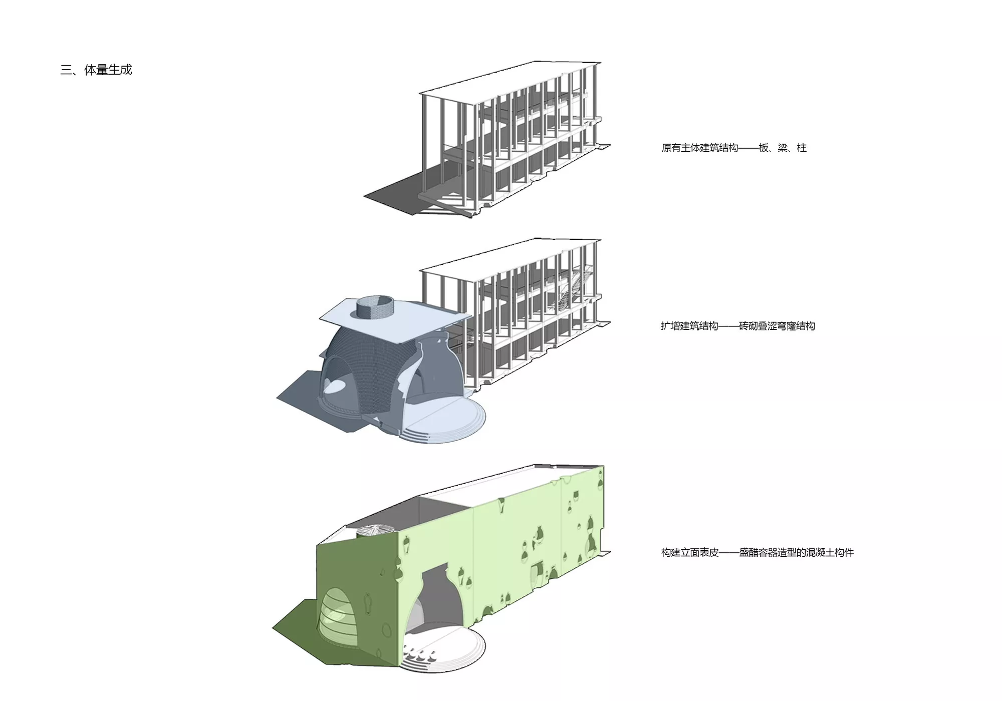 醋的古老歷史和壇子、罐子等古樸的容器給予設(shè)計者最初的設(shè)計靈感。建筑的形體總體上是個簡單的立方體,老子說“大象無形、大音希聲”。建筑立面的紋理猶如地質(zhì)學上的斷層剖面,使得建筑猶如從地下生長出來一般,而立面上的凹槽則是埋在地底的古代容器印在立方體上的痕跡。