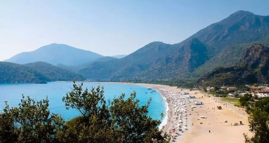 從杰米勒島向東不遠,便是費特希耶最遐邇聞名的地方:厄呂代尼茲(Oludeniz),也稱“死?!?,其景色絕不遜于約旦的“死海”。風和日麗、波瀾不驚的港灣里洋溢著歡快氛圍,各種娛樂設施一應俱全,還能乘坐滑翔傘體驗“上帝視角”下的碧海白沙。
