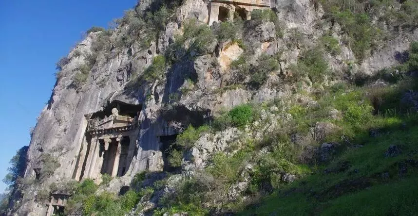 目前這里最神奇最令人嘆為觀止的古跡無疑是鑿刻在城南連綿峭壁間的利西亞石棺(Stone Sarcophagi)。遠遠望去,綠樹掩映中,高聳陡峻的懸崖上被挖鑿出無數(shù)密如蜂巢的深邃孔洞,每個洞窟內(nèi)都存有珍貴精美的石棺。