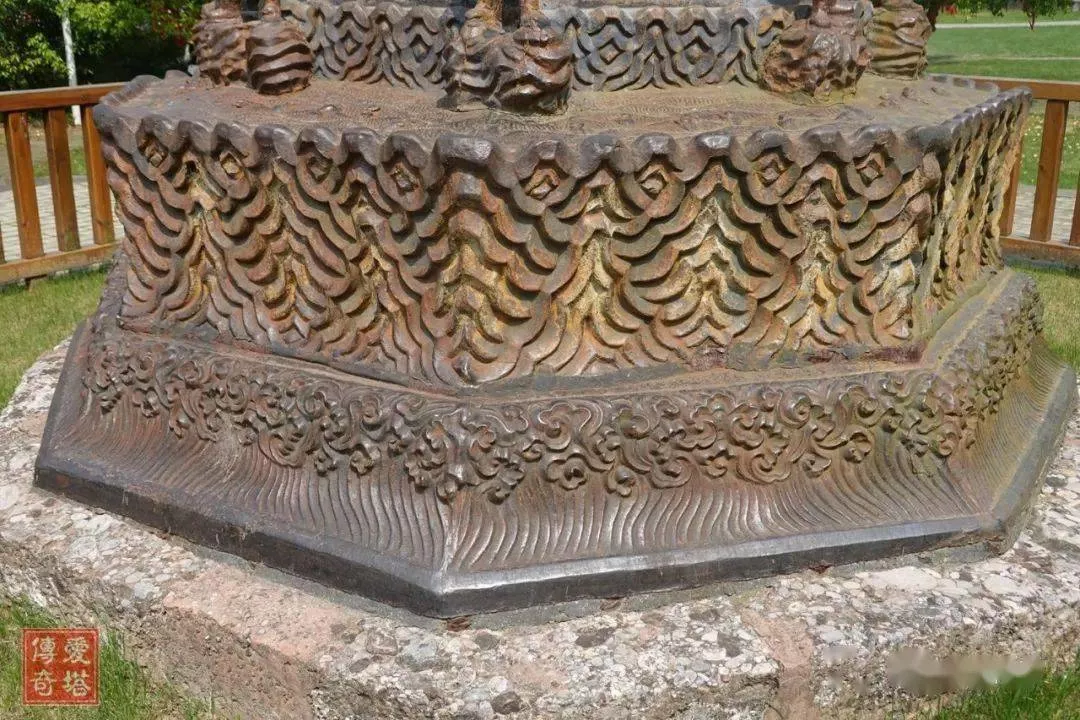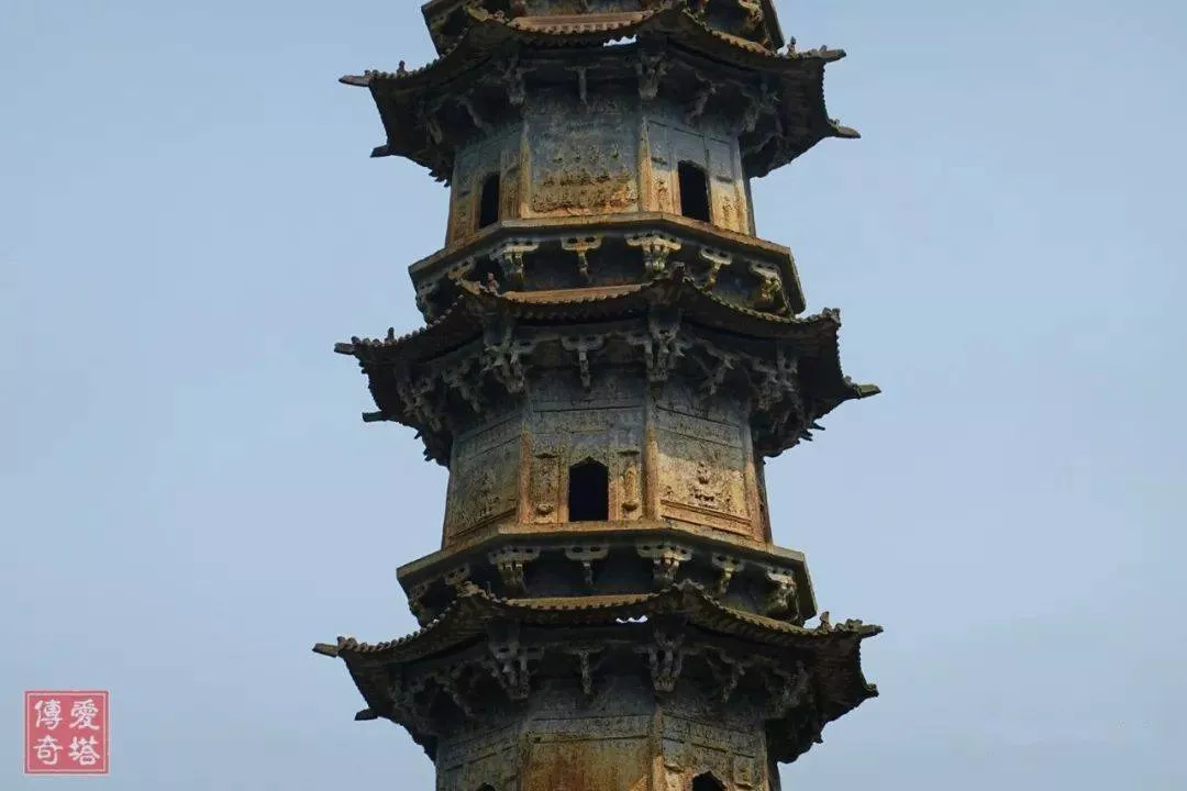 鐵塔最下方是山海造型的底座,其上是力士托舉的須彌座,再上是十三級(jí)仿木結(jié)構(gòu)鑄造的塔身,采用一檐一平坐,逐級(jí)略有收分