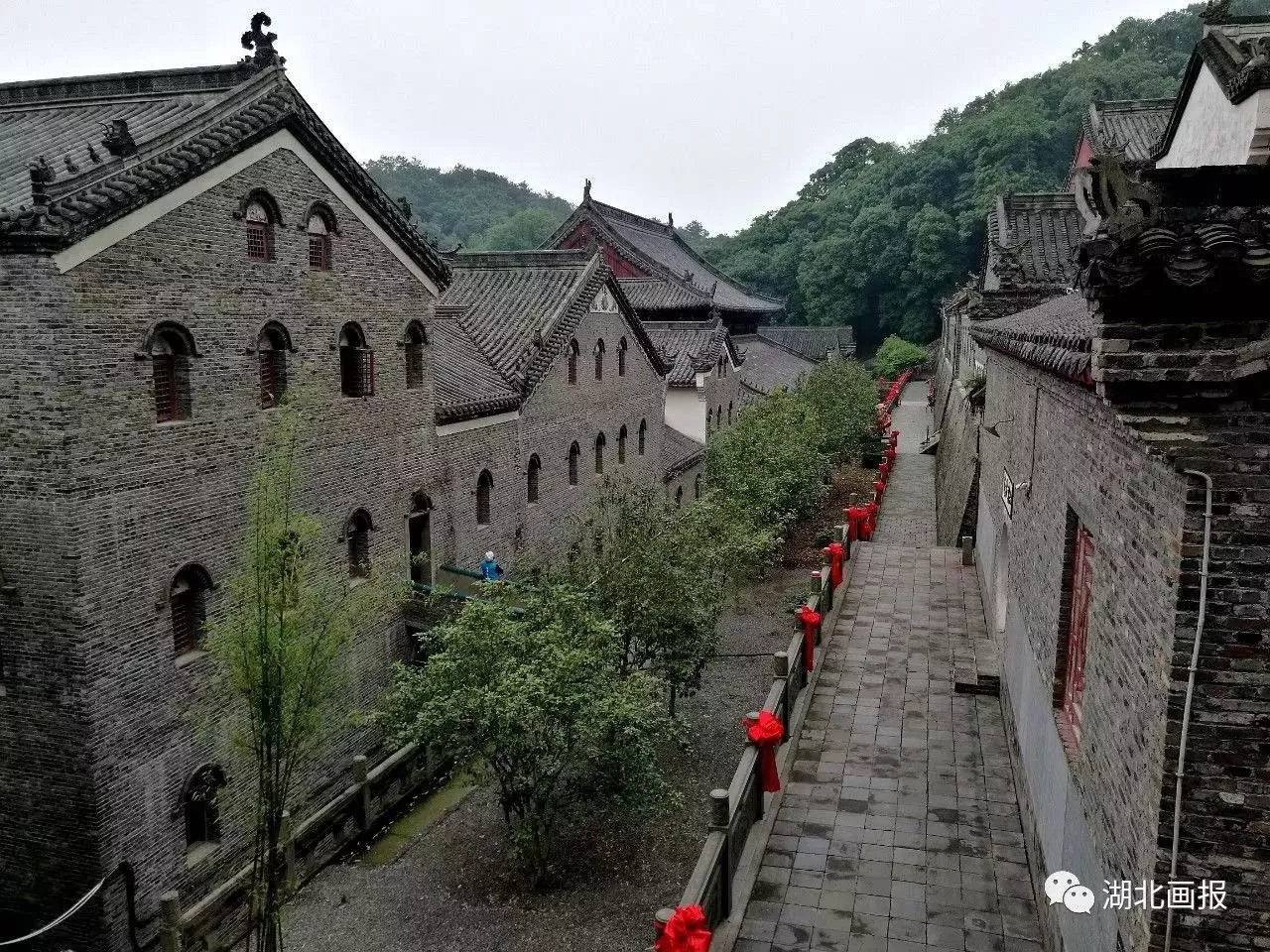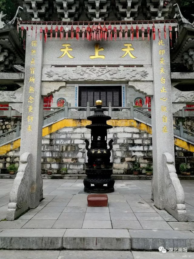 簡(jiǎn)單的介紹一下其中的天王殿,天王殿是中軸線上的第一座建筑,坐西朝東,門前有寬闊的廣場(chǎng)。面闊七間,進(jìn)深三間,除了高大的中門外,在盡間各開一園門,南盡間作票房。粉墻高5米;屋面為單檐硬山灰筒瓦頂,正脊的云龍拼版和吞脊大吻,全部是灰陶制品。殿內(nèi)梁架為木結(jié)構(gòu)穿斗式,是鄂西地方民居的一般做法。殿內(nèi)造像全為現(xiàn)代重塑。明間正面本尊,是彌勒化身的布袋和尚坐像,漢白玉石料。彌勒佛背后,雕塑手執(zhí)寶杵,現(xiàn)天將軍身的韋馱天像,全身金盔金甲,左手握杵拄地,右手插腰,左足略向前立,面向大雄寶殿。在天王殿南北梢間,塑四大天王像。天王殿始建時(shí)間不詳,自明代以來經(jīng)過多次重修。