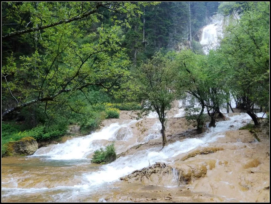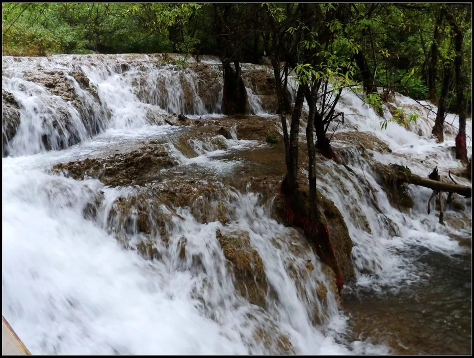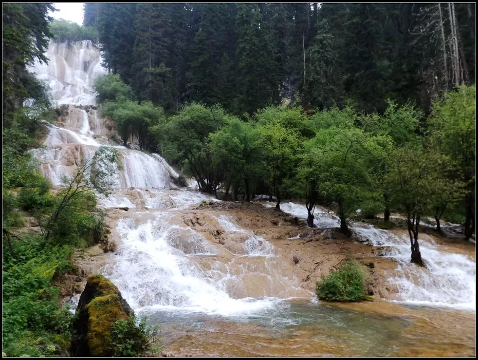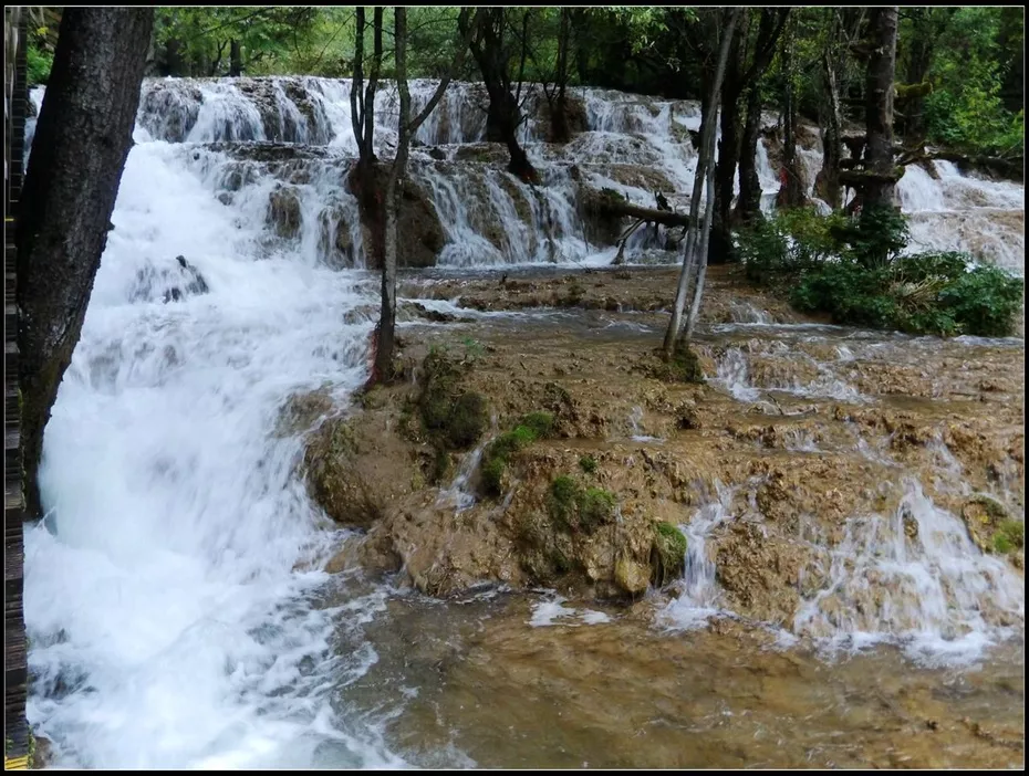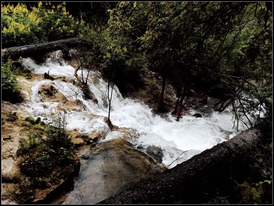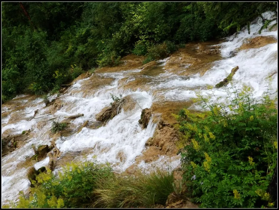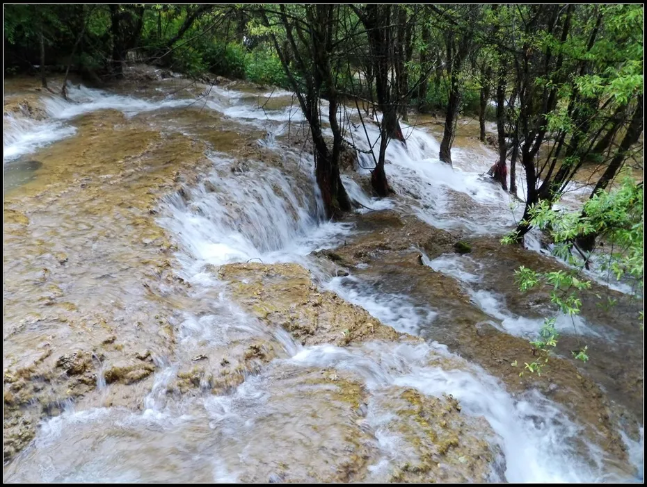 濤聲越來越大,走過不長的一段林中路我們拐向了溝底。牟尼溝景區(qū)與黃龍景區(qū)的地勢類似,都是兩側(cè)山勢陡峭,溝卻相對較寬,坡度也較緩,溝底是層層疊疊的鈣化巖,河水在鈣化巖層上向下奔流,形成一級級跌落,只是牟尼溝的鈣化巖呈赭色,色彩不如黃龍的鈣化巖那么鮮艷。
