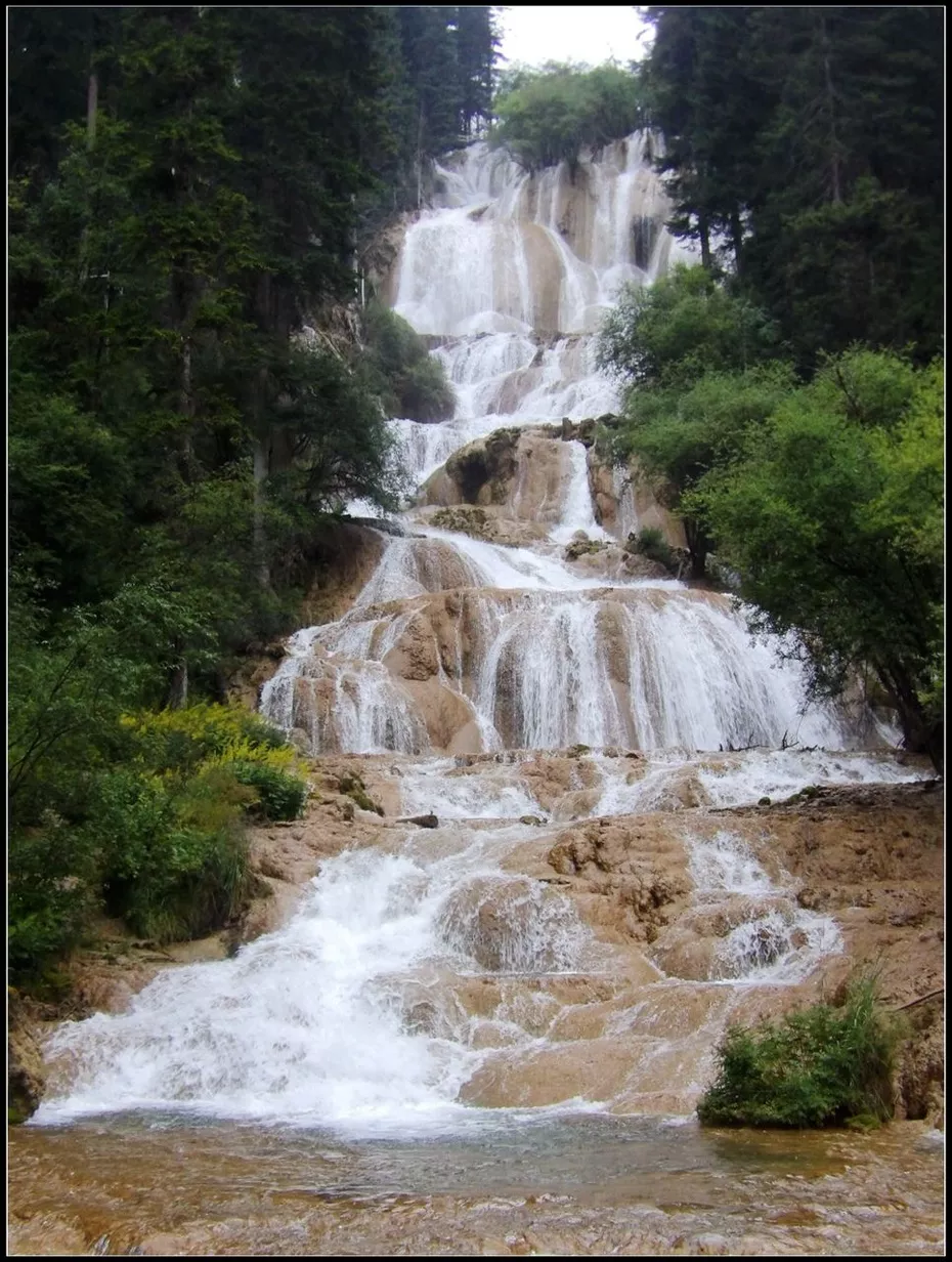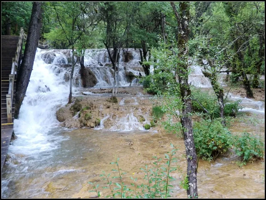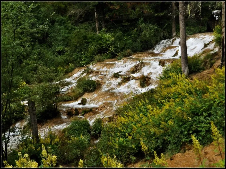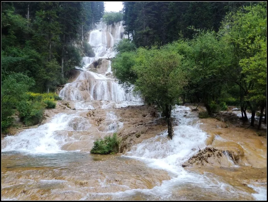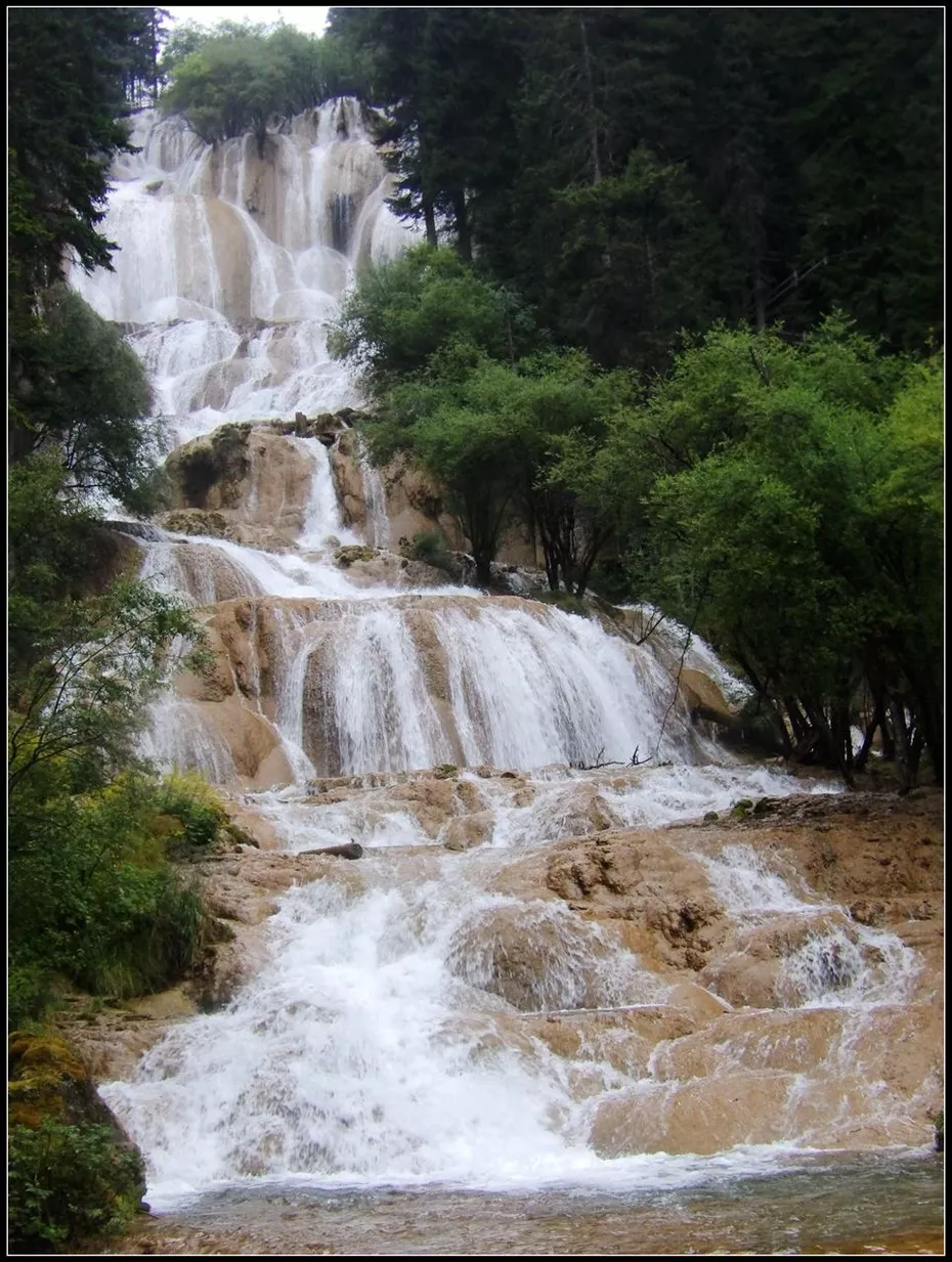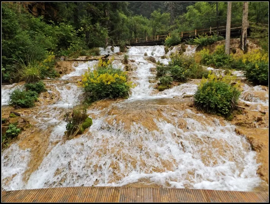 濤聲越來越大,走過不長的一段林中路我們拐向了溝底。牟尼溝景區(qū)與黃龍景區(qū)的地勢類似,都是兩側(cè)山勢陡峭,溝卻相對較寬,坡度也較緩,溝底是層層疊疊的鈣化巖,河水在鈣化巖層上向下奔流,形成一級級跌落,只是牟尼溝的鈣化巖呈赭色,色彩不如黃龍的鈣化巖那么鮮艷。