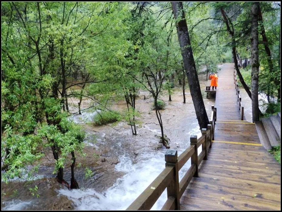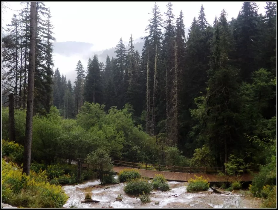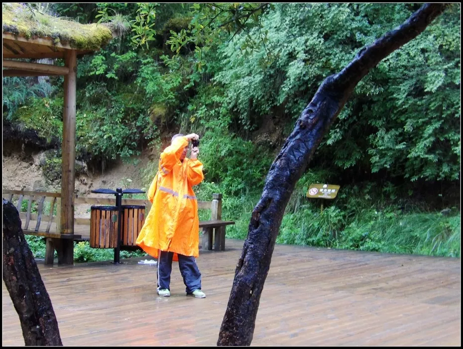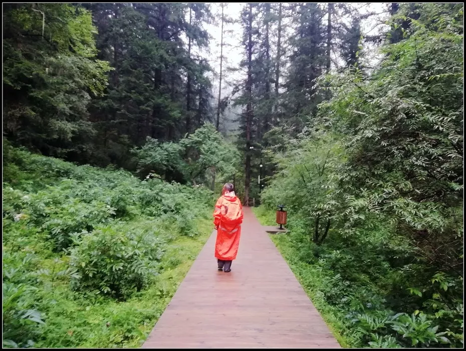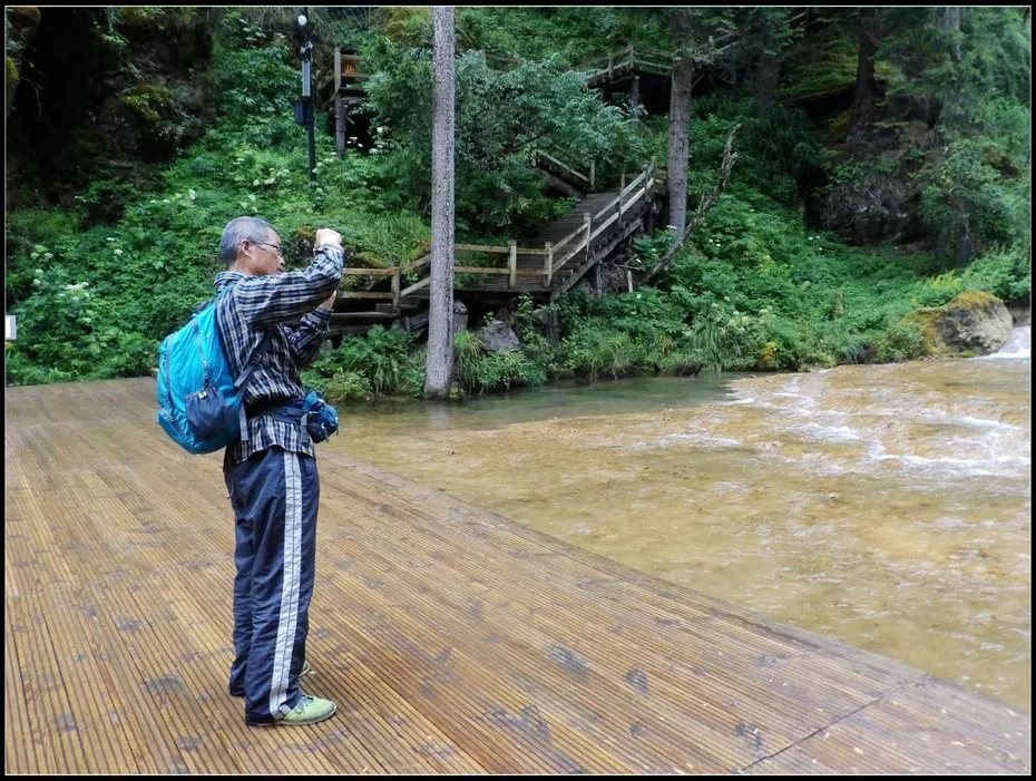 頂著紛紛揚(yáng)揚(yáng)的細(xì)雨我們上路了。走在景區(qū)的木棧道上,我思緒萬千:現(xiàn)在的景區(qū),不論規(guī)模大小都要修成木棧道,這已是司空見慣的事實(shí),即使原來的石頭臺(tái)階路好好的也得改成木棧道,還冠名環(huán)保棧道,好象唯木不高端,唯木不環(huán)保。牟尼溝景區(qū)也是的木棧道??尚弈緱?a href='/daozhen/' target=_blank>道真的就環(huán)保么?未必。請問那些木頭不是砍樹得來的么,砍多少樹才能修一條木棧道?這玩藝究竟是環(huán)保還是毀林?當(dāng)然,景區(qū)修木棧道并不是砍的本地樹,可別處的樹也是樹呀。就沒有一個(gè)更好的方式,非得都修成木棧道才環(huán)保?