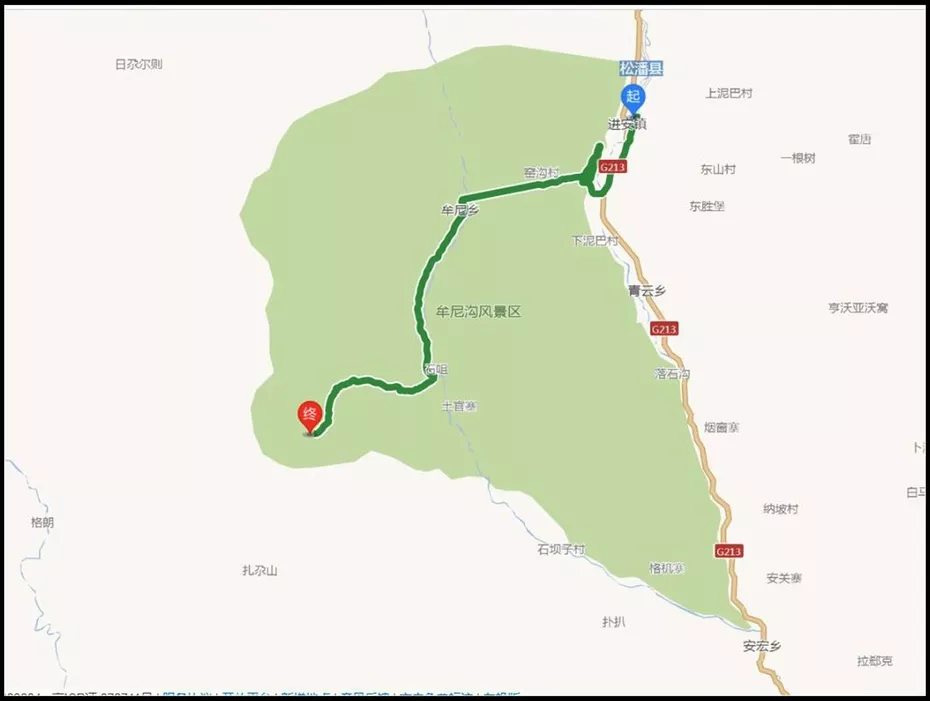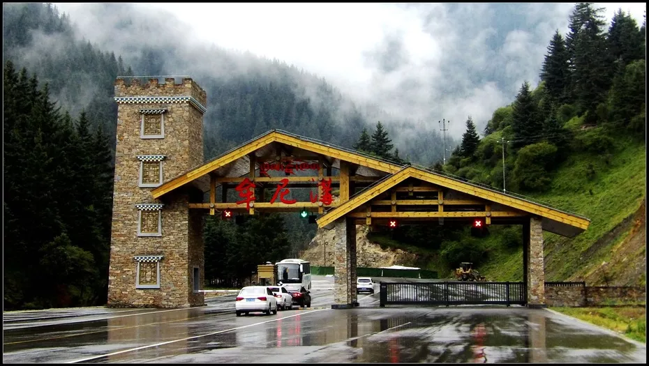 為爭取時(shí)間,我們和馬師付定的是7點(diǎn)出發(fā),不到7點(diǎn)馬師付已在樓下等我們了。牟尼溝景區(qū)分兩個(gè)景區(qū),扎嘎瀑布和二道海景區(qū),我最想去的是扎嘎瀑布,據(jù)說那個(gè)瀑布特別壯觀。所以我定的第一站先去扎嘎瀑布。當(dāng)我們在霏霏細(xì)雨中到達(dá)景區(qū)大門時(shí),時(shí)間還不到7點(diǎn)20,景區(qū)還沒上班。扎嘎瀑布景區(qū)大門建的比較靠外,離景區(qū)停車場還有5公里,因溝里還有村寨 ,所以景區(qū)大門日夜不關(guān)。馬師付說了聲“出來時(shí)再買票”,拉著我們直接就進(jìn)去了。原來景區(qū)還可以這樣玩。
