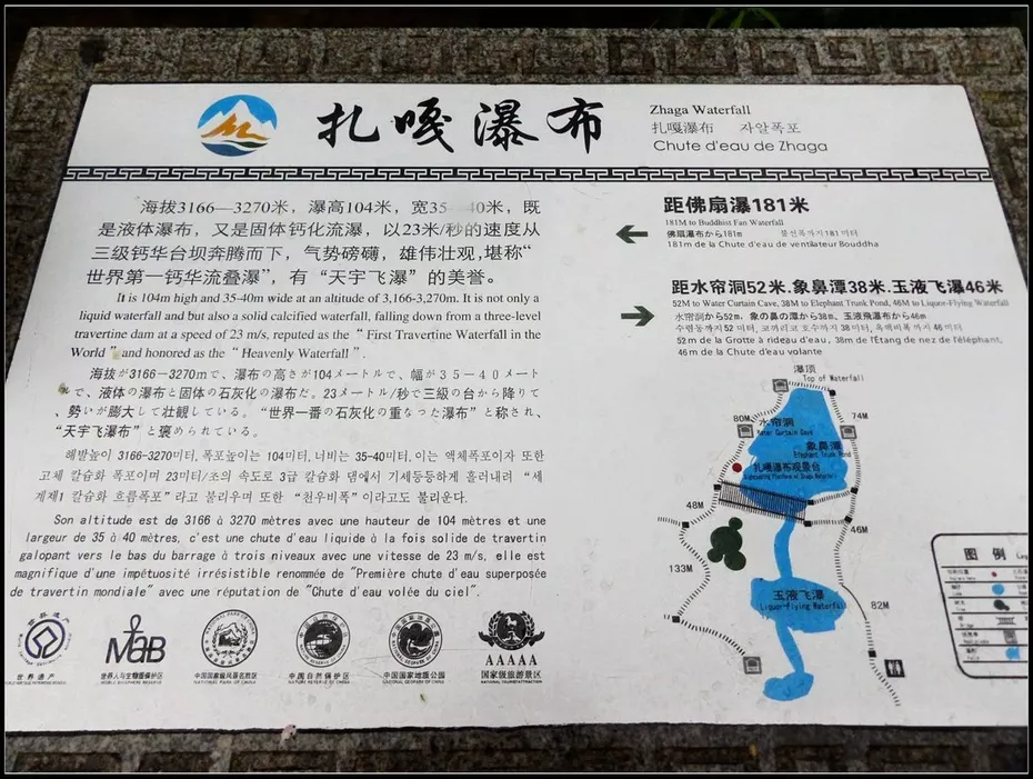 扎嘎瀑布地處海拔3166米和3270米之間,瀑布高104米(一說93.2米),寬35-40米,是世界最大的鈣化流瀑布,有天宇飛瀑之譽(yù)。扎嘎瀑布的上游是一個(gè)湖泊(即海子),下游為一串階梯式河床。上百個(gè)層層疊疊的鈣化環(huán)型瀑布玉串珠連,經(jīng)三級鈣化臺(tái)階跌宕而下,沖擊成巨大鈣化面而形成朵朵巨大白花,瀑聲如雷,聲形兼?zhèn)洹T诖笃俨嫉诙A的鈣化壁上,有一"水簾洞",洞口水流飛掛,洞內(nèi)黑森森的,據(jù)說里邊氣象萬端,不知真假。