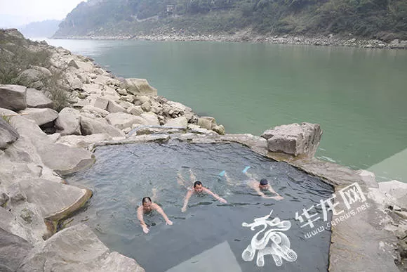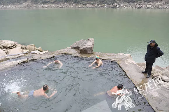 溫泉池與旁邊的嘉陵江面呈現(xiàn)約2米的高度差,在冬季的枯水期,可謂“泉水不犯江水”,很多人在此一邊泡溫泉,一邊休閑聊天,一邊欣賞嘉陵江上的美景。